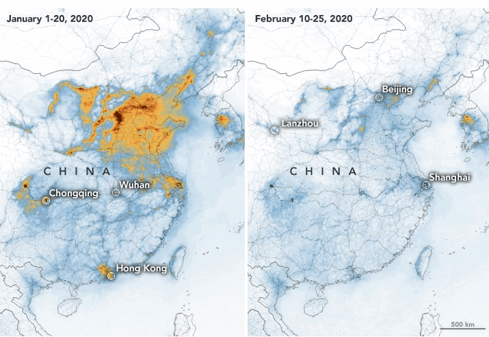 These photos shows a huge drop in the NO2 rates in china after the outbreak of Covid19 which caused the lockdown of all the factories and caused the Quarantine which has greatly reduced the chances for car emissions.